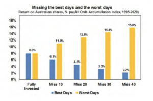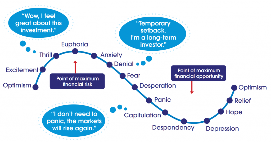 We are passionate about helping our clients achieve their financial goals and understand that one of the biggest obstacles in achieving appropriate investor outcomes is behaviour. Fear and greed drive us to make irrational decisions at the most inappropriate times. The chart above shows that if you missed just 40 of the best days from 1995 to 2020, you would have achieved a return of just 2.2%. versus staying put with your investments and gaining 8%. Admittedly, if you missed the 40 worst days you could have achieved a return of 15.8% however, I do not know of an investor that has been able to time the market to perfection! Hence why you may have heard the adage “its time in the market not timing the market” that gets us to our investment goals. Its times like this that its so important to remain focused on the long term and not join the rollercoaster of investor emotion that goes like this:
