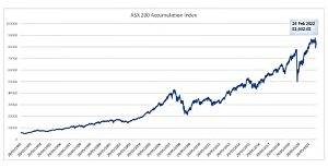 The following chart shows the return of the ASX 200 Accumulation index from May 1992 to February 2022. The accumulation index shows the growth of the market including the reinvestment of the dividends received. The return comes out at approximately 9% p.a. over that period.